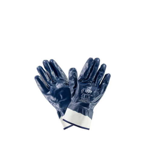 Pamut alapanyagra csuklóig mártott védőkesztyű, vastag nitril mártással és merev mandzsettával. Minősítés: CE KAT I.
