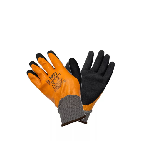 Poliészter alapanyagú, csukóig nitrilbe mártott védőkesztyű rugalmas mandzsettával. Tenyerén rugalmas, habosított, homokos nitril bevonattal ujjbegyig mártva.