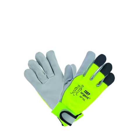 Kecskebőr védőkesztyű láthatósági poliészter kézfejjel, tépőzáras mandzsettával, három ujjhegyen fényvisszaverővel ellátva.