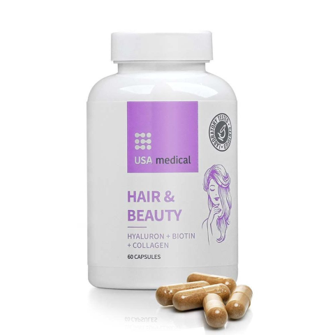 Az USA Medical HAIR & BEAUTY Hajvitamin kapszula a haj, a körmök és a bőr egészségét támogató vitaminkomplex hylauronnal, kollagénnel és biotinnal, melynek segítségével természetes szépséged teljessége igazán felragyoghat! A cink hozzájárul a haj és a kör