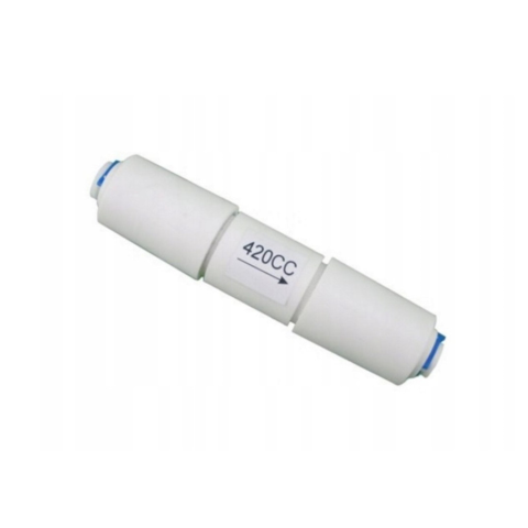420-as áramláskorlátozó + 2 darab bilincs - tömlőrögzítő csap A vízáramlás-korlátozót (fojtót) fordított ozmózisú rendszerekben használják , a szennyezett víz membránról a csatornarendszerbe történő kifolyásánál. Az áramláskorlátozó 75 GPD kapacitású memb