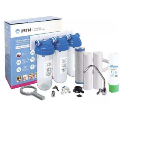 Háromlépcsős vízszűrő rendszer – konyhapult alá szerelhető, megbízható víztisztítás minden napra Ez a háromlépcsős USTM vízszűrő rendszer egy fixen beépíthető megoldás a konyhai mosogató alá. Nem díszeleg a pulton, mégis minden csapmegnyitásnál kristályti
