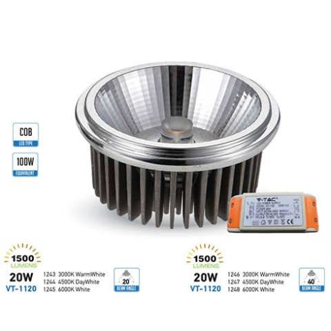 1 kép V-tac LED lámpa AR111 COB 20W 20° 12V (Reflektor) hideg fehér