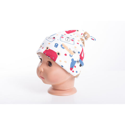 Normál fazonú, fülnél a sapka pereme miatt enyhén vastagabb, felül csomós dizájnnal rendelkező babasapka. Anyaga: 100% pamut 30 fokon mosható. Méret meghatározása: fejkörfogat alapján ajánlott.