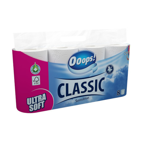 Ooops! Classic Sensitive 8 tek. 3rtg. TP Ooops! Classic Sensitive egy 8 tekercses csomagban érkező, 3‑rétegű toalettpapír, amelyet kifejezetten érzékeny bőrre terveztek. Illatanyagmentes és dermatológiailag tesztelt, hogy a mindennapi higiénia mellet