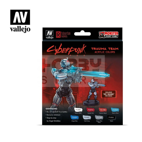 Vallejo Cyberpunk Trauma Team festékszett + Exclusive figura 72310 Vallejo Model Color és Game Color akrilfestékeket tartalmazó szett. A készlet tartalmaz egy exlusive Doc Salvage műgyanta figurát és egy lépésről lépésre útmutatót is! A szett tartalma: