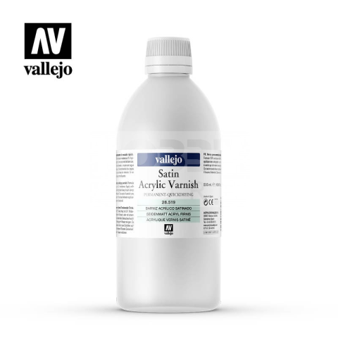 Vallejo Satin Acrylic Varnish 500 ml - szatén akril lakk 28519 A Vallejo Satin Acrylic Varnish gyors száradású és rendkívül jó keménységű szatén akril lakk. Megvédi a festett modelleket maketteket a karcolásoktól, szennyeződésektől és nedvességtől. UV ál