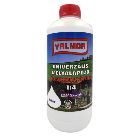 A VALMOR Univerzális Mélyalapozó oldószermentes, alkalmas minden ásványi eredetű felületre kül- és beltérben: tégla, cserép, vakolat, homlokzat, lábazat, gipszkarton, beton, stb. impregnálására. Koncentrátum, 1:4 arányú 1 liter