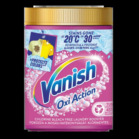 Vanish Oxi Action Pink folttisztító por biztonságosan eltünteti a foltokat már 20°C-on 30 perc alatt. A por többfunkciós, így akár mosáshoz, áztatáshoz vagy előkezeléshez is használható. Formulája megóvja a színeket és minimalizálja a kellemetlen szagokat.