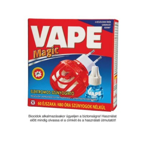 A Vape Magic elektromos készülék zárt térben szúnyogok elpusztítására és elriasztására alkalmas. A készülék egyaránt alkalmas a Vape folyadék utántöltő és a Vape lapkák párologtatására. Összetevők Hatóanyag: 1,33 g pralletrin, Etoc oldószer és p