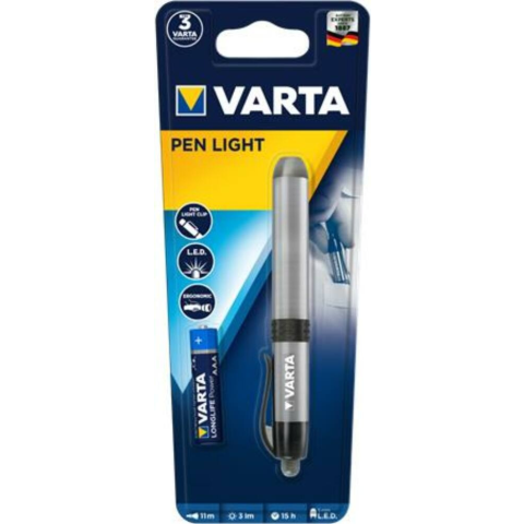 Elemlámpa, LED, 1xAAA, VARTA Pen light (VELA68) Alumínium burkolat biztosítja a tartós használatot -5 mm-es LED-nek köszönhetően hosszú élettartamú elemek -praktikus rögzítőcsíptető -VARTA-típus: 16611 -tömeg (elemekkel együtt): 27,5 gr -hosszúság: 11