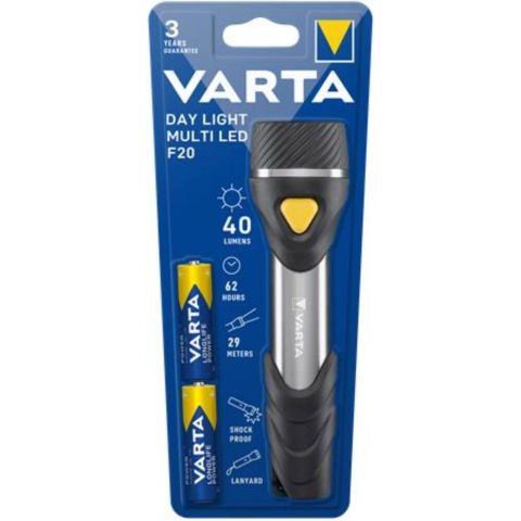Elemlámpa, LED, 2xAA, VARTA Day Light F20 (VELA65) Multi-LED Robusztus, három alapanyagból, alumíniumból, ABS műanyagból és gumiból készült elemlámpa Ütésálló burkolat, a fokozott kültéri megbízhatóság érdekében Praktikus csuklószíj Fénytávolság: 29 mé
