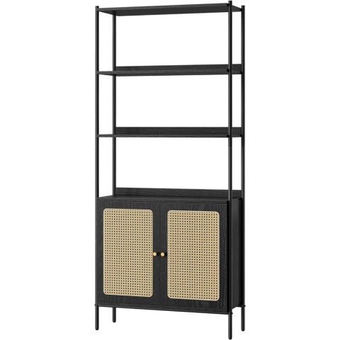 1 kép Vasagle 6 szintes könyvespolc, magas állópolc rattanszerű ajtókkal, Boho stílus, fekete