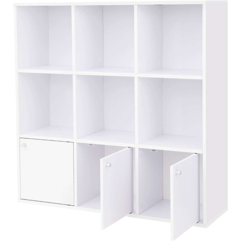 1 kép Vasagle Fa könyvespolc, 9 kockával, 3 alsó szekrénnyel, 98x98x29cm, fehér