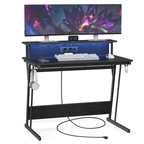 Íróasztal LED világítással, íróasztal beépített elosztóval, számítógép asztal, monitorállvány 2 monitorhoz, hálószoba, 60 x 100 x 76 cm, klasszikus fekete:Praktikus beépített elosztó: Ez az asztal 2 aljzattal és 2 USB porttal van felszerelve, és lehetővé teszi több eszköz egyidejű töltését, így interferencia és töltési problémák nélkül merülhet el játékvilágábanAtmoszférikus LED lámpák: Ez az asztal 20 színben, 6 üzemmódban és 5 villogási frekv