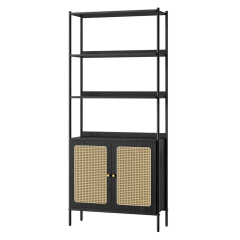1 kép Vasagle Könyvespolc, 2 rattan hatású ajtóval, fém kerettel, fekete 76x30x174cm