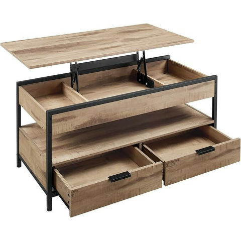 Innovatív dohányzóasztal emelhető asztallappal, amely 48 cm-ről 63 cm-re állítható a kényelmes munkavégzés, étkezés vagy játék érdekében. Bőséges tárolóhelyet kínál 3 rejtett rekesszel, 2 fiókkal és nyitott polccal, miközben stílusos ipari megjelenésé...