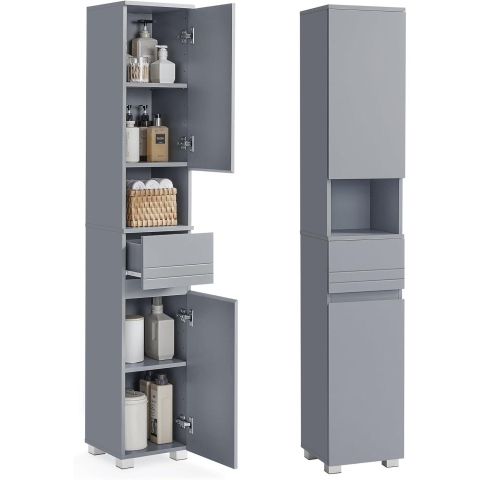 VASAGLE magas fürdőszobai szekrény, keskeny tárolószekrény, karcsú szekrényke fiókkal, állítható polcokkal, 30 × 30 × 170 cm, misztikus szürke színben Praktikus tárolás Ez a keskeny fürdőszobai szekrény felső és alsó ajtós részt, polcokat és fiókot kínál. Összesen hat rekesszel és háromféle tárolási megoldással segít rendszerezni a különböző tárgyakat. Sokoldalú elhelyezés A felső és alsó ajtók igény szerint balra vagy jobbra is felszerelhetők,