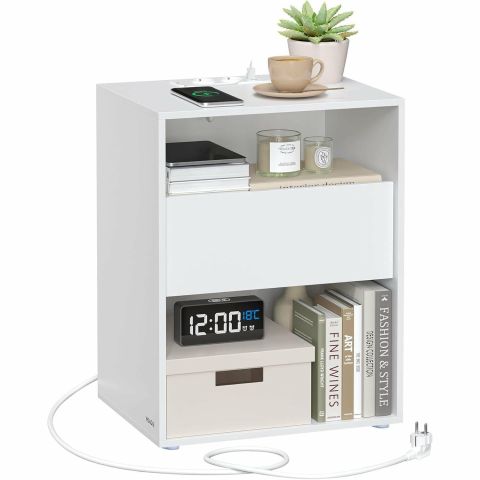 Vasagle Ultragyors összeszerelésű, éjjeliszekrény, kisasztal elosztóval és fiókkal, matt fehér