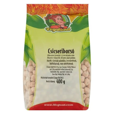 Vegabond csicseriborsó 400 g A vegetáriánusok körében igen népszerű, azonban nem csak nekik jó választás, hiszen nagyon egészséges és vitaminokban gazdag. Alapanyagként szolgál a humusz, valamint a falafel elkészítéséhez, de nagyon finom salátákban, cu