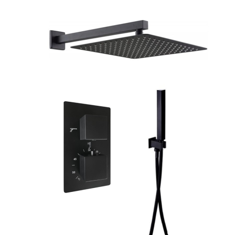 MANVELD FEKETE PRÉMIUM TERMOSZTATIKUS TUSOLÓ KÉSZLET -Rejtett 3 funkciós termosztatikus csaptelep -E-BOX -ULTRA-SLIM zuhanyfej, négyzet 30 x 30 cm -Választható fali vagy mennyezeti kar -Szögcsatlakozás fogantyúval -Fekete zuhanycső -Kézizuhany ELŐREN
