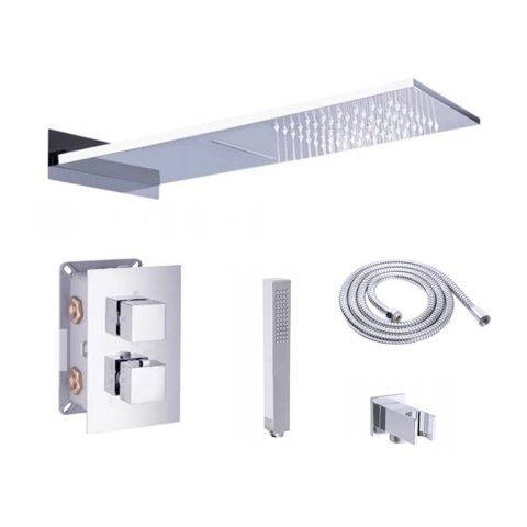 Manveld zuhanyszett Cascade THERMO EBOX-szal - Termosztatikus csaptelep - E-BOX - Zuhanyfej - Szögcsatlakozás fogantyúval - Fém fonott zuhanycső vagy Pvc ELŐRENDELHETŐ! Technikai paraméterek: -Zuhanyfej méretei: 50x22cm -A csap rozetta