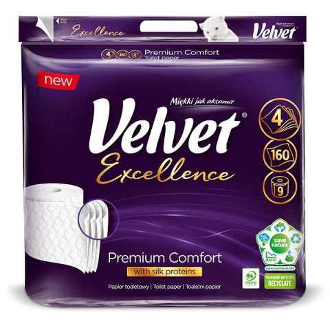 WC papír - négyrétegű, illatmentes A VELVET Excellence toalettpapír nagy, ideálisan feltekert, erős papírtekercsekből áll, amelyek négy réteg puha, finom papírból készülnek. A strapabíró, erős és hófehér lapok, esztétikus dombornyomott