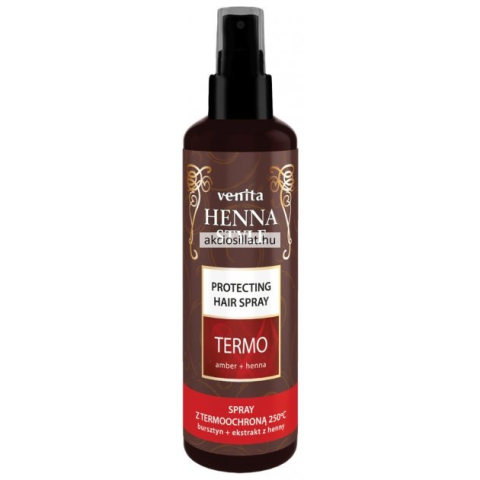 Venita Henna Style Termo Hajformázó spray termovédelemmel 250°C-ig 200ml Védi a hajat a magas hőmérséklettől, 250°C-ig (hajszárító, hajsütő, hajvasaló). Megkönnyíti a haj kifésülését és formázását, bársonyos puhaságot, rugalmasságot és könnyedséget ad a
