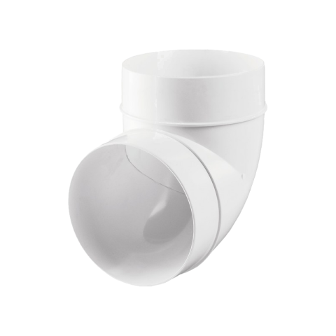 Fehér PVC-ből készült, befúváshoz és elszíváshoz használt légtechnikai elem. Műanyag könyök idom, 125 mm körcsatornához, 90 fok