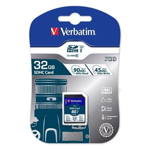 2 kép Verbatim Memóriakártya, SDHC, 32GB, CL10/U3, 90/45MB/sec, VERBATIM PRO (MVS32GP)