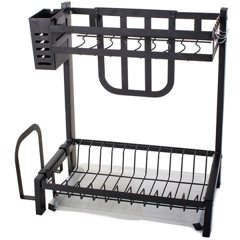 Konyhai rendszerező - fémből és műanyagból készült, tágas, evőeszköztartó, tartó a konyhakések és vágódeszkák számára, a rendszerező fel van szerelve egy műanyag tálcával a lecsöpögő víz felfogására, 4 akasztó, fekete szín, méretei magasság 40 cm, szélesség 35 cm, mélység 22,5 cm, a felső polc mélysége 13,5 cm, tálca méretei 32 cm × 22 cm, késtartó mérete 20 cm × 17 cm, evőeszköztartó mérete 11 cm × 7,5 cm × 4,5 cm, a vágódeszkapolc mérete