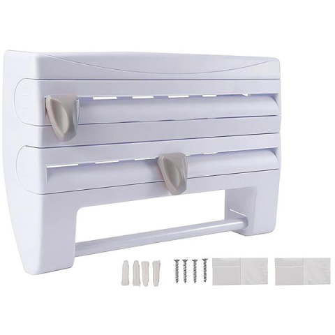 Konyhai papírtörlő tartó - multifunkcionális, két darab fóliatekercs max. 31 cm hosszú, és egy tekercs papírtörlő max. hossza 27 cm, átmérő legfeljebb 10 cm, éles vágókések, 5 cm mély felső polc a fűszerek stb. számára, falra szerelés, dűbelek,, csavarok és egy készlet kétoldalas öntapadó alátét a csomagban, méretek 24 × 38 × 9 cm Multifunkční zásobník na alobal a papírové utěrky Verk 24177 nesmí chybět v žádné kuchyni. Ostré nože na řezání po