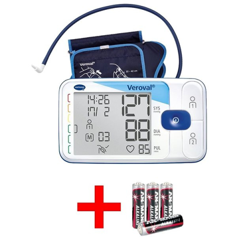 Vérnyomásmérő felkaros - oszcillometrikus mérési módszer, aritmia mérése, vérnyomásmérés 3 mmHg pontossággal, pulzusmérés 5 % pontossággal, 42 cm-es mandzsetta, grafikai megjelenítés, akkumulátor állapotjelzés és kijelző, 2 felhasználónak, a memóriában max. 200 mérést tárol, 4 elemmel, védőcsomagolás és elemek a csomagban, fehér kivitel A praktikus Hartmann Veroval felkaros vérnyomásmérővel rendszeresen ellenőrizheted vérnyomásodat és pluzusodat. A mé