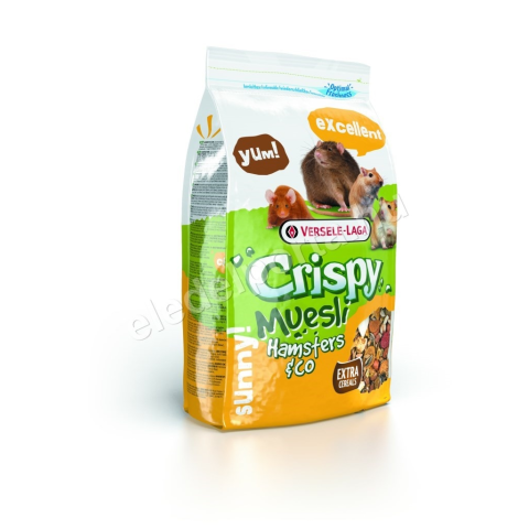 A Versele-Laga Crispy Muesli Hamster & Co - Müzli eleség egy kiváló minőségű táplálék hörcsögöknek, egereknek, patkányoknak és futóegereknek. Gazdag gabonafélékben, zöldségekben, gyümölcsökben és fehérjékben, ideális az egészséges táplálkozáshoz. Fedez