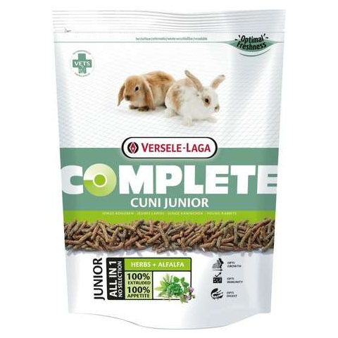 A Versele-Laga Complete Cuni Junior egy fehérjében gazdag, minden az egyben extrudált táp, amely kifejezetten 0–8 hónapos (törpe)nyulak igényeire lett kifejlesztve. Az ízletes pelletek megelőzik a válogatási reflexet, így biztosítva, hogy fiatal nyula minden létfontosságú tápanyaghoz hozzájuthasson az egészséges fejlődéshez. A magas rosttartalom és a hosszú rostok – például a lucernaszéna – elősegítik az optimális emésztést, míg a kiemelt kalcium-, f