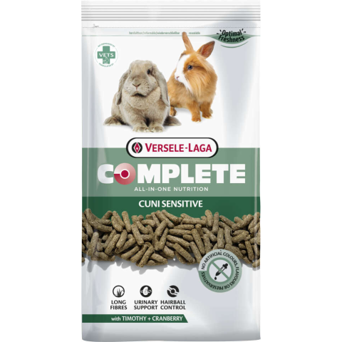 A Versele-Laga Complete Cuni Sensitive problémamentes táplálkozást jelent. A különösen ízletes, minden az egyben pelletek megelőzik a válogatási reflexet. Ilymódon nyula megkap minden létfontosságú tápanyagot és tökéletesen egészséges marad. Magas rosttartalmú táplálék, természetes hosszú rostokkal, megelőzi a szőrgombócok képződését és az elhízást. Az optimális kalciumtartalom és vörösáfonya kivonat segít karbantartani az egészséges húgyuta