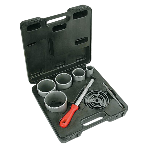 VERTO Vídiaszemcsés koronafúró készlet, 5 db-os (ref. száma 6H9), 32-83 mm méretekben, furatok készítésére betonban, téglában, csempében. A műanyag dobozban kényelmesen tárolható a készlet. A készlet kiegészítő elemével, a Vídiaszemcsés reszelővel a kifúrt munkadarabok kézi utókidolgozása oldható meg. A VERTO elektromos kéziszerszám tartozékok választékát kínálja az ezermesterek számára.