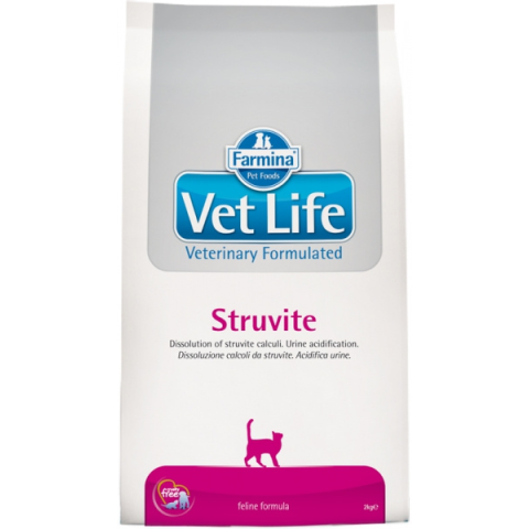 Vet Life Cat Struvite száraztáp  Ha macskája struvitkövekben szenved, hasznos lehet egy adaptált diétás száraztáp. A Farmina Vet Life Struvite Feline diétás macskaeledel speciális összetételű, a struvitkövek feloldását elősegítő táp.A Farmina Vet Life Struvite Feline húgysavasító összetevőket tartalmaz, amelyek hozzájárulnak a vizelet struvitkövek számára kedvezőtlen pH-értékéhez, és így elősegíthetik azok lebomlását. A diétás macskatáp alacsony ma