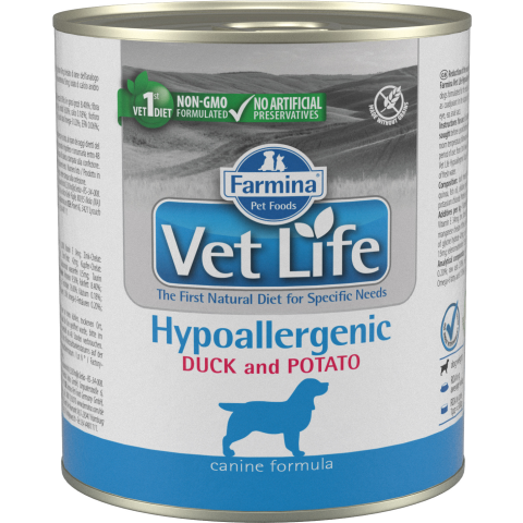 Vet Life Natural Diet Dog Hypoallergenic Duck&Potato nedvestáp Hypoallergenic Duck&Potato (Hipoallergén Kacsa & Burgonya) konzerv eledel kutyák részére A táplálék-intolerancia csökkentésére, kacsa és burgonya tartalommal. Farmina Vet Life Hypoallergenic Duck & Potato teljes értékű diétás eledel kutyáknak a táplálék-intolerancia csökkentésére kifejlesztve. Koadjuvánsként javasolt a bőr és függelékeinek, mint szem, fül, bűzmirigy támogatására. Használati útmu