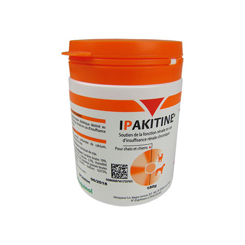 Vétoquinol Ipakitine por - Táplálékkiegészítő, a vesefunkció segítésére, krónikus veseelégtelenségben szenvedő kutyák és macskák részére. Az Ipakitine macskák és kutyák foszfor-, ammónia (urea,kreatinin)-és koleszterin-terhelésének csökkentésére szol