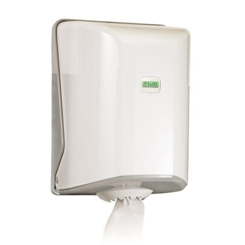 Vialli tekercses kéztörlő adagoló. 19 cm átmérőjű belső mag adagolású papír kéztörlővel használható. Az adagoló nyílása tépőfogakkal van ellátva, így perforált és perforáció nélküli papírral is használható. Vialli Maxi tekercses kéztörlő adagoló ABS fe