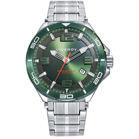 Karóra férfiaknak - analóg idő megjelenítés, óramű típusa quartz, kerek számlap, ásványi számlap, 200 m (20 ATM) vízhatlanság, a tok anyaga acél, a tok színe zöld, a szíj anyaga orvosi acél, a szíj színe ezüst, cserélhető szíjjal A kiváló minőségű Viceroy 46839-65 férfiaknak karóra jó szolgálatot tesz a mindennapokban. Az alapját egy 44 mm átmérőjű kerek számlap alkotja. A Quartz technológia hosszú élettartamot és precíz időmé