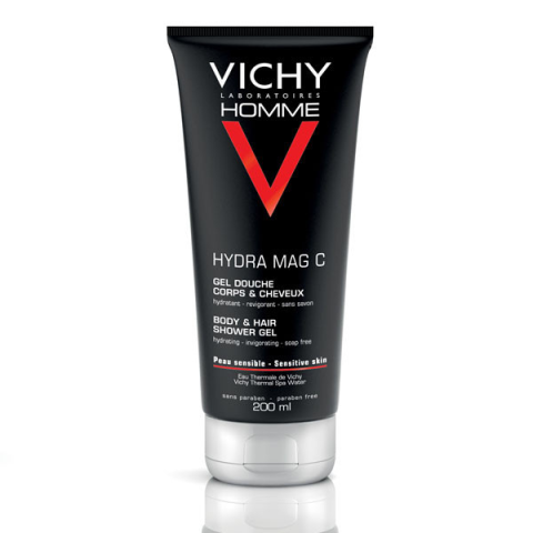 A Vichy Homme Hydra Mag C tusfürdő gél testre és hajra , amely hidratál és frissít. Hydra Mag C tusfürdő Cg-vitaminnal + magnéziummal gazdagítva, illetve a bőr pH-értékével azonos pH-értékkel kifejlesztve: A test és a haj mindennapos tisztításáért