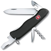 Svájci bicska - zárható, a felszerelés része csavarhúzó, kulcstartó, krimpelő, konzervnyitó, fogpiszkáló, csipesz, palacknyitó, dugóhúzó és lyukasztó, penge hossza 8 cm, bezárt kés hossza 11,1 cm Kés az utazáshozA fekete Victorinox Picknicker zsebkés tizenhárom funkcióval rendelkezik, köztük fűrésszel és acél kulcskarikával. Ez egy 91 milliméteres modell, amely ideális a mindennapi használatra