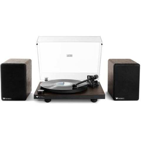 Lemezjátszó - modern dizájn, fa, hangszórókkal, fedővel, hangerő szabályzás, beépített előerősítő, sebesség 33,3 és 45 fordulat/perc, Hi-Fi, szíjas hajtás, félautomata vezérlés, egyenes szárú kar, Bluetooth, RCA kimenet, elektromágneses (mm/mc) hangszedő, slipmat alátét, átalakító 45 fordulat/perchez és RCA kábel a csomagban, tömege 6,4 kg, méretek 345 × 420 × 115 mm (Ma×Sz×Mé), fekete és barna kivitel Victrola Premiere T1 lemezjátszó egy pár hangszór