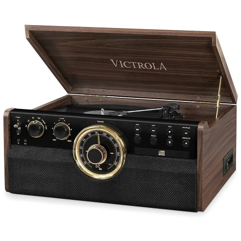 Lemezjátszó - retro dizájn, fa, hangszórókkal, fedővel, sebesség szabályozás, beépített előerősítő, sebesség 33,3, 45 és 78 fordulat/perc, Hi-Fi, szíjas hajtás, automata vezérlés, egyirányba tört szárú kar, Bluetooth, rádió, RCA kimenet, fejhallgató kimenet, piezoelektromos (kerámia, kristály) hangszedő, tömege 8,3 kg, méretek 380 × 480 × 200 mm (Ma×Sz×Mé), barna kivitel Többfunkciós 6-in-1 lemezjátszó, retro kialakítássalEbbe az elegáns, retro stílu