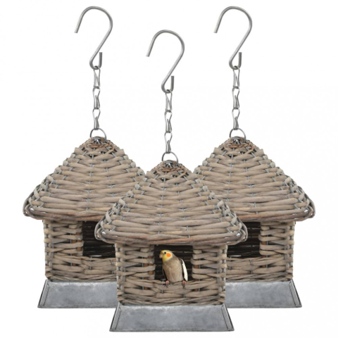 Fűzfavesszőből készült pompás kis madárházunk barátságos és kényelmes odút nyújt papagájának és egyéb madarainak akár a kertben, akár az erkélyen. Erkélye vagy háza környéke vidámabb lesz ezekkel a kézzel készült madárházakkal! A madárházak szerkezete tartós öntöttvasból van, amire erős rattanból fonott borítás került. Egy-egy madárpárnak szolgálnak odúként. A szett 3 fonott vesszőből készült madárházat tartalmaz. Fontos megjegyzés: Ezek a te