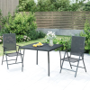 Ez a divatos kerti étkezőgarnitúra elegáns és modern megjelenésével nagyszerű választás a kertben való pihenéshez. Erős anyag: Az acél rendkívül kemény és erős anyag. Erőt és stabilitást biztosít. Az acél por- és e-szórata védőréteget képez a kopással ás korrózióval szemben.Stabil váz: Az étkezőgarnitúra por- és e-szórt acélváza erős szerkezetet és stabilitást biztosít.Állítható és összecsukható funkció: Az étkezőszékek háttámlái igény