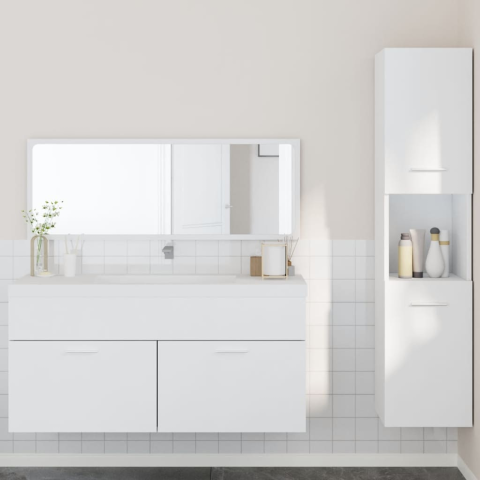 Ez a stílusos fürdőszobaszekrény-garnitúra fürdőszobája nagyszerű kiegészítője lesz, rendezett és lenyűgöző megjelenést kölcsönözve neki! Tartós anyag: A szerelt fa kivételes minőségű, sima felületű, szilárd, stabil, és ellenáll a nedvességnek. A szerelt fából készült fürdőszobai tárolószekrény erős és tartós. Bőséges tárolóhely: A fürdőszobabútor bőséges tárolóhelyet kínál a fürdőszobai kellékek rendszerezéséhez. Falra szerelhető: A