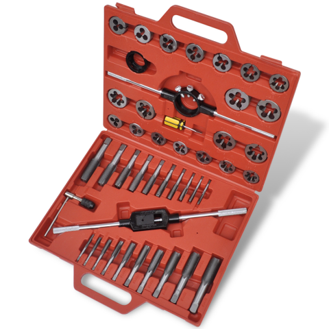 Ez a 45 darabos, praktikus menetmetsző és -fúró készlet, tökéletes lesz belső és külső meneteknek, és használható autóipari és általános mechanikai műhely használatra. Kiváló minőségű szénacélból készült. Az eszközök hő kezeltek és az erőre és tartósságra edzettek. A tartalmazott kényelmes hord táskának köszönhetően, ezek az eszközök szállítása egyszerű és nem vesz igénybe túl sok helyet. A szállítás tartalmaz 1 x 50 mm-es menetfúró kulcs